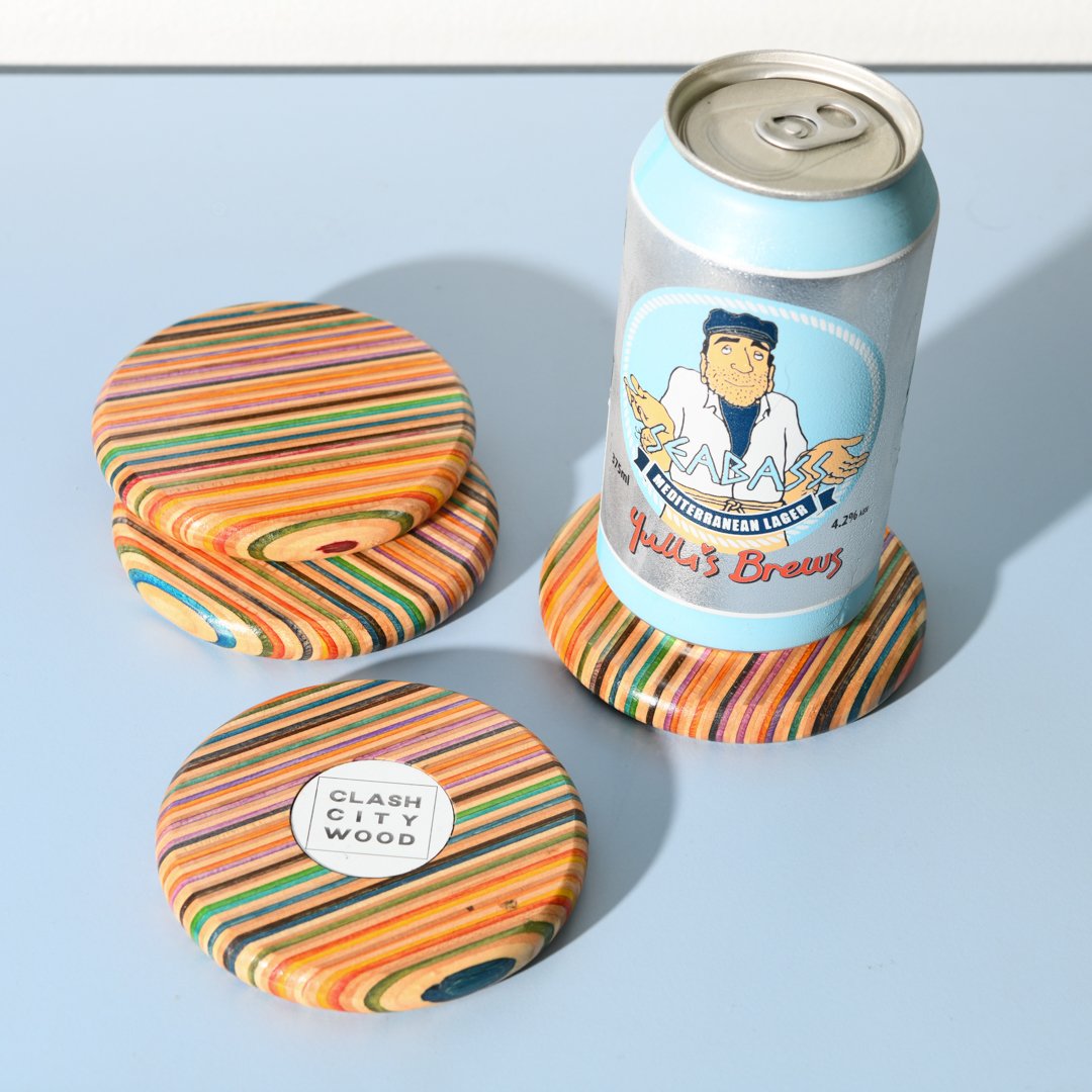 Each mini tinnie table is handmade from...yep...recycled skateboards. Clocking in at around 9cm in diameter and 1.2cm thick, these solid little wheels of rad will not only support your beverage of choice, but believe it or not will also protect that precious table top.